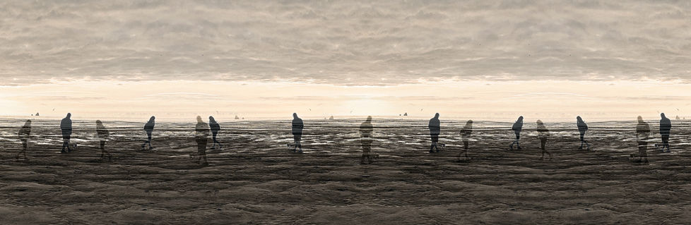 A series of symmetrical coastal scenes featuring rock formations, mist, and mirrored sea waves meeting at the center.